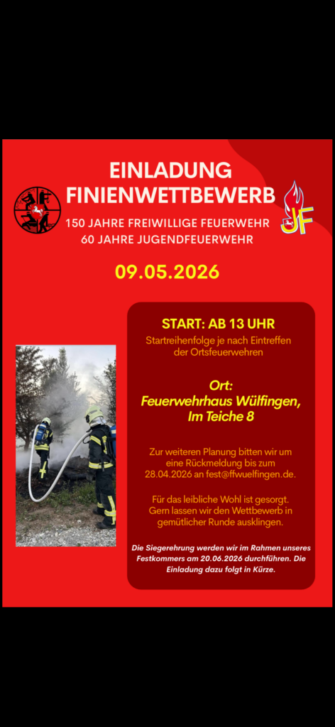 wir laden euch herzlich zu unserem aufregenden Finienwettkampf ein! Gemeinsam zeigen wir Teamgeist, Geschicklichkeit und die besten Fähigkeiten im Feuerwehrsport.