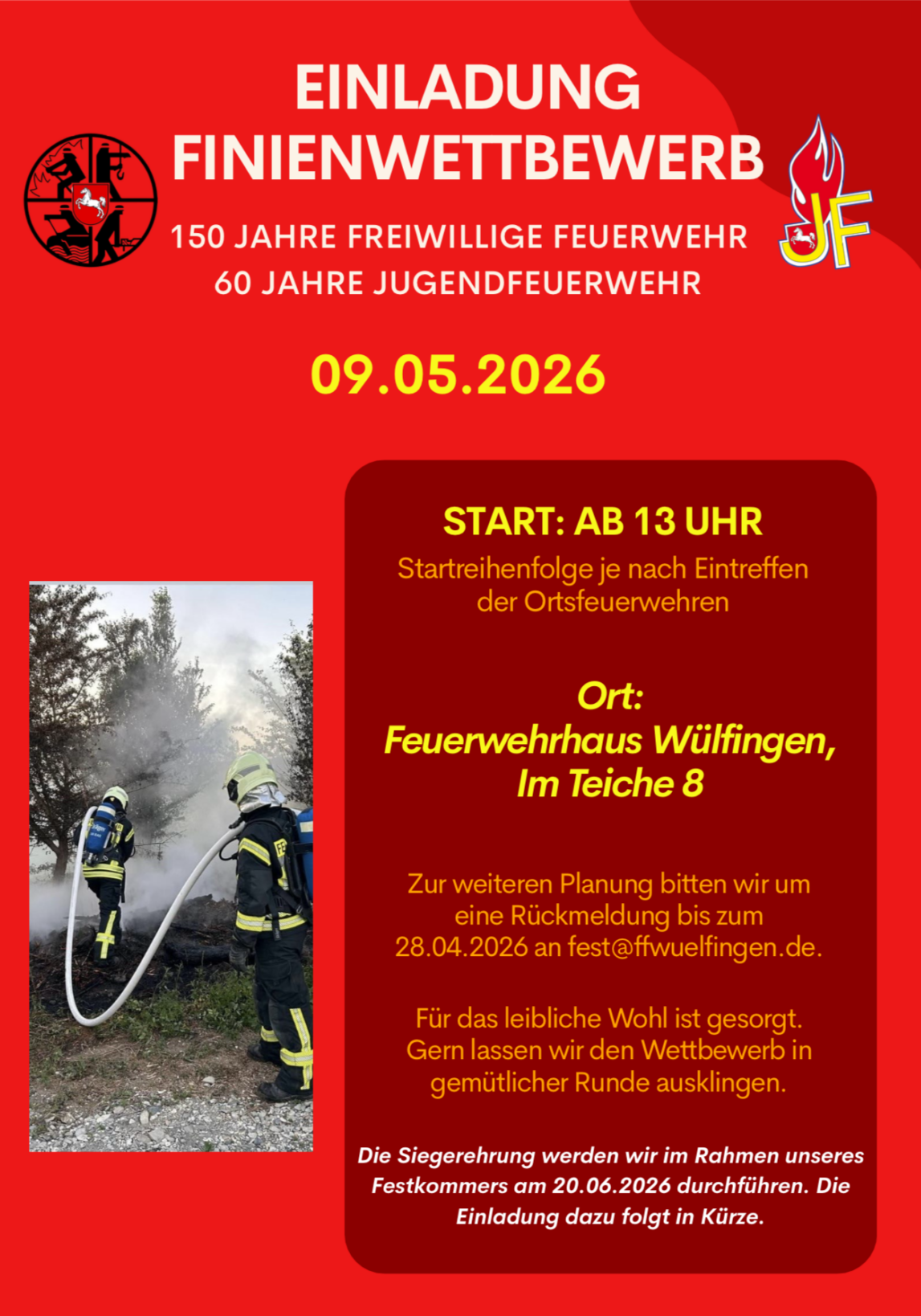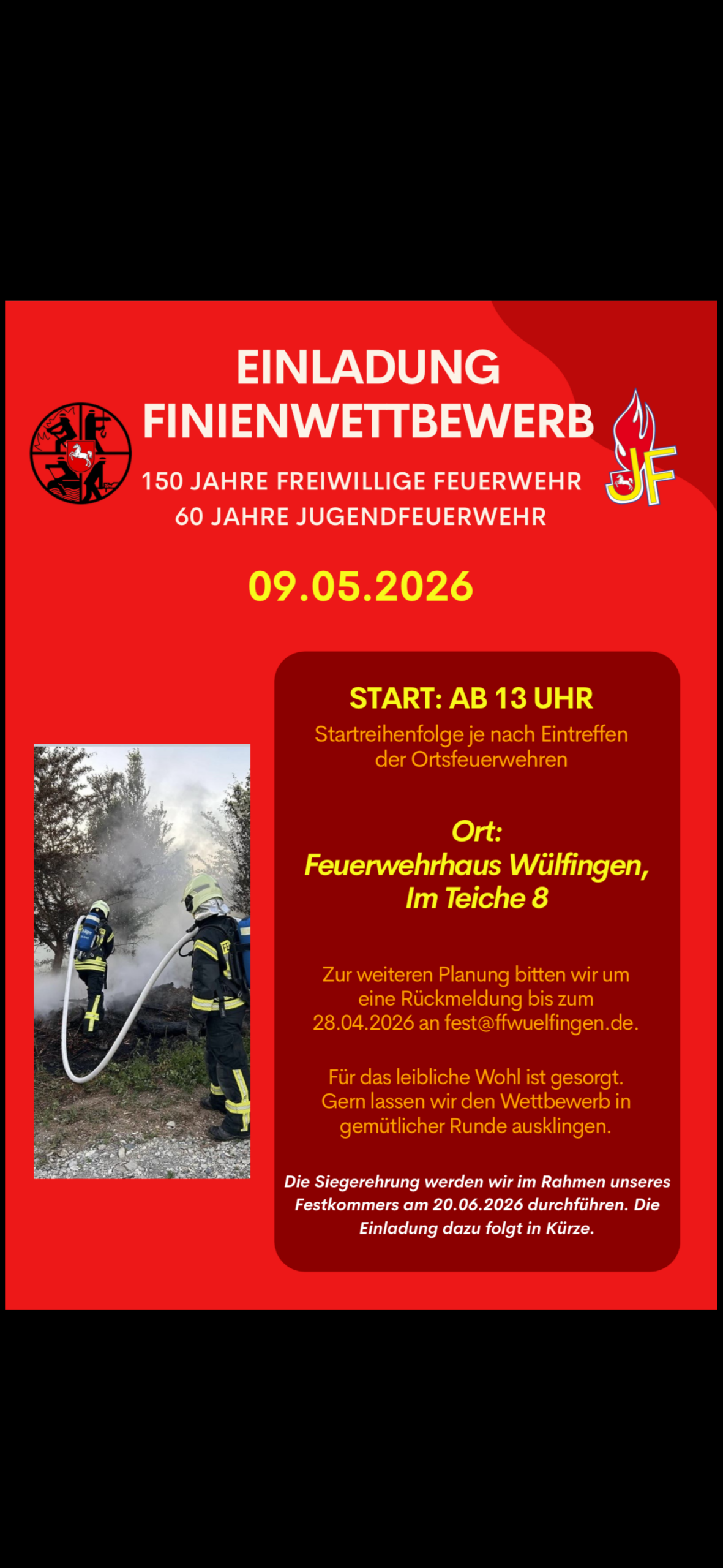 Wenn eure Feuerwehr teilnehmen möchte, meldet euch bitte bis zum 28.04.2026 unter fest@ffwuelfingen.de an!